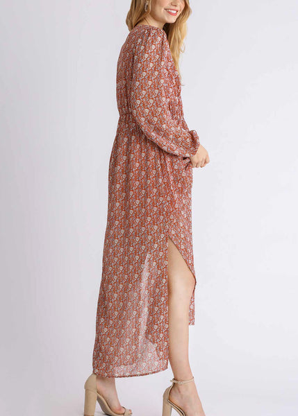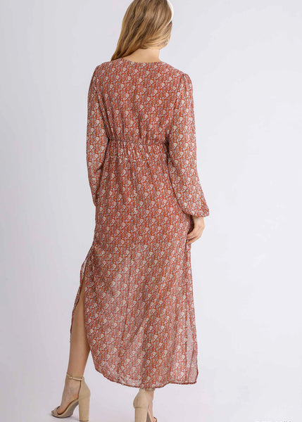 Step into your Wildest Dreams with this romantic floral maxi that feels straight out of a daydream. Featuring a sheer, flowy fabric lined for comfort, this dress moves with effortless grace. The smocked waist and V-neckline flatter your silhouette, while the long, billowy sleeves and side slits add a touch of whimsy and allure.