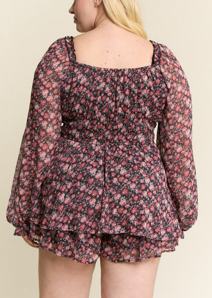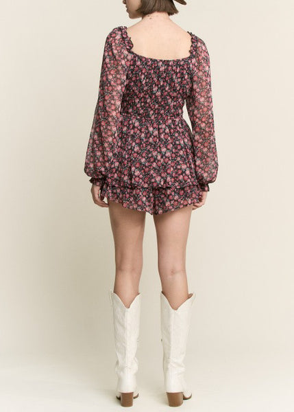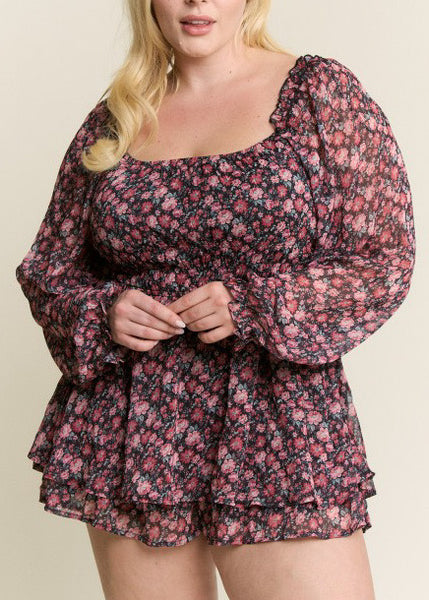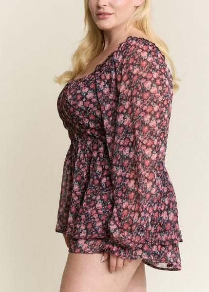 Romantic and timeless, our A Thousand Years Fall Floral Romper captures the beauty of every fleeting moment. Designed with a sheer floral overlay and soft lining, this piece blends comfort with elegance. The long sleeves feature elastic cuffs for a touch of flowy femininity, while the elastic square neckline offers a flattering, versatile fit.