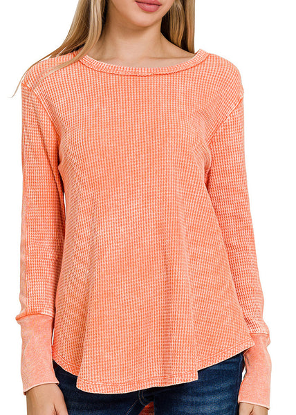Slip into effortless comfort with this washed baby waffle long sleeve top. Designed with a soft, textured knit and an easy relaxed fit, it’s the perfect everyday layer you’ll never want to take off. The washed finish gives it that lived-in look and feel, while the lightweight waffle fabric makes it cozy without being heavy. Style it solo with your favorite jeans, or layer it under jackets and vests when the weather cools down. No matter how you wear it, this top is all about keeping you comfy, casual, and feelin’ good.
