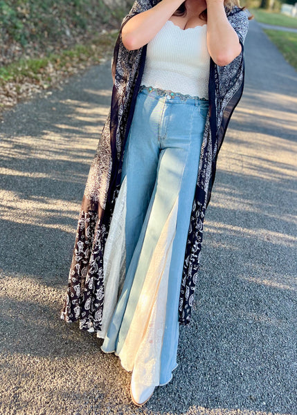 Make a bold statement in the Cowgirls Don’t Cry Jeans — where rugged Western spirit meets feminine flair. These wide leg jeans feature mix-media lace detailing that sets them apart, adding a touch of romance to their rodeo-ready edge. Designed with amazing stretch for all-day comfort, they move with you whether you’re dancing at a concert, strolling through a festival, or saddling up for the rodeo. A true statement piece, these jeans bring together boho soul and Western attitude in one unforgettable look.
