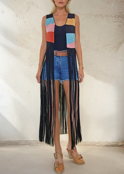 Step into the spotlight with this maxi colorblock sunrise vest, designed to bring bold bohemian energy to every outfit. Crafted in luxe faux suede with flowing fringe, it blends Western edge with festival-ready flair. The warm sunrise-inspired palette makes it the perfect statement piece for layering over dresses, denim, or cutoff shorts. Whether you’re dancing under desert skies or channeling free-spirited vibes in the city, this duster vest turns every look into a show-stopping moment.